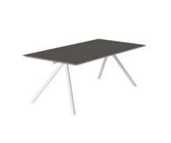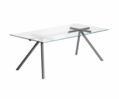 Mesa de comedor W de Capdell, diseño de Gabriel Teixidó. Espectacular mesa realizada con estructura de tubo de acero recubierto de pintura epoxi de la carta de acabados metálicos de Capdell. Sobres con diferentes acabados, materiales y medidas. Tapas en cristal extraclaro 12mm, cristal color 12mm, HDF 19mm, contrachapado roble 19mm.
